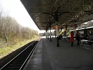 The cutbacks of the mid to late 1960s saw all the long-distance services diverted via other routes, rendering the additional ("fast line") tracks obsolete and they were taken out of use on 21 November 1965. The inner tracks and platform faces on each side were retained to serve the two remaining lines to begin with (even though the tracks had previously been arranged with fast lines serving one island platform and the slows the other), but in the late 1980s the surviving tracks were realigned so as to serve just one of the two island platforms (the one used by the old fast lines) in order to allow the other to be abandoned.[3] It was subsequently demolished and the former site is now heavily overgrown.