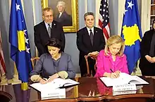 Jahjaga and U.S. Secretary of State Hillary Clinton sign the US-Kosovo Agreement on the Protection and Preservation of Cultural Properties