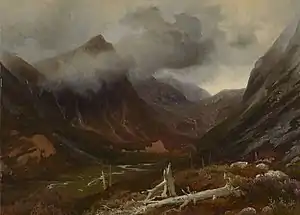 In 1844 and 1847, together with August Leu and Georg Saal, he visited Norway; painting a series of fjordscapes.[2] In 1854, he stayed in London for several weeks to study the museums. His brother, Ernst, had been serving there as a librarian and Royal Tutor since 1851. A meeting was arranged with Prince Albert, who purchased Becker's painting "The Jungfrau", as a gift for Queen Victoria. In the years to come, she acquired more paintings and, in 1864, invited him to visit Scotland. In 1869, he paid a brief visit to her estate, Osborne House, on the Isle of Wight.