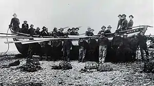 The first records of a launch of The Augusta where lives were saved, happened on 5 February 1841.[2] The Dygden[4] was a 600-ton barque from the Baltic port of Åbo (now the city of Turku in Finland). The Dygden, which was carrying a cargo of timber, had been struggling in the stormy seas of the North Sea for fourteen days and had become so completely lost that the barques captain had mistaken St Nicholas Church in Blakeney for Dover Castle and so had thought his ship had reached the English Channel. The Augusta was launched in raging seas with waves crashing over her to go to the assistance of the Dygden which had now got into difficulties of west of Blakeney. When the lifeboat reached the barque the captain and crew were taken aboard, however the Captain wanted to leave a cabin boy aboard the ship to prevent salvage claims being made by others. Eventually the coxswain of the Augusta persuaded the Captain that all 17 members of the crew should be taken off the ship and the Captain and crew were saved and landed at Brancaster.[4] Augusta's services were not recorded at the time although tradition credits her with 200 launches and over 1,000 lives saved, however research so far has established more realistic figures of just over 200 lives saved in 16 launches with 4 further unconfirmed services.[2] During the 56 years of Augusta's service, not one lifeboatman was lost, this may well be attributed to the skill of the Coxswain and crews and their local knowledge of this part of the coast and not least of all because they always wore their lifejackets.[2]