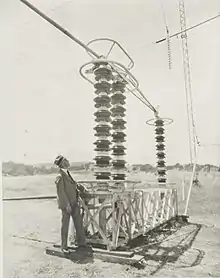 The major infrastructural expansion of electrical capacity from these programs increased demand for Bowie III's products, and placed his company into an important position as a government contractor. As the 1930s began, low-voltage (2300 volt) electrical distribution systems were the standard, and they could only carry electricity about four miles before voltage drop rendered the remaining current useless for standard domestic applications.[23] To increase the viability of high-voltage current carriage to rural and suburban areas (including outlying regions of Bowie's Bay Area home such as San Jose, Gilroy, Mountain View, Martinez, etc.), innovative (and often expensive) higher-voltage systems were needed to handle capacity for lines that would carry power over 40 miles from a station.[24] For these new high-voltage systems, as well as centralized hydropower projects that generated unprecedented amounts of electrical current, the potential for injuries, explosions, and destruction of equipment was very high, so new high-capacity switches were required to be able to manage the power effectively and safely – the Bowie Switch Company was a locus for innovation and implementation of these switches, and the company kept very busy during the 1930s.[25] One of Bowie's greatest achievements during this period were the innovative 287,000 volt (287kv) disconnecting switches, which at the time and for many years thereafter were by far the world's largest (in mass and capacity) and weighed over 1000 pounds each. These switches were designed for the enormous quantity of power generated by Hoover Dam and Grand Coulee Dam, and were the only way to safely regulate the flow of electricity from the harsh environmental surroundings of their generation sites through power lines that had the capacity to carry electricity over 250 miles to urban, rural, and newly developing suburban areas.[25][26]