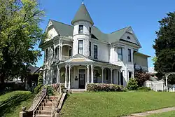 Built in 1895, the 2+12-story, wood-frame house is notable as one of the city's finest turn-of-the-century Queen Anne style houses. It features the irregular massing, typical of the style, with a single-story wraparound porch with delicate spindled woodwork, and a three-story circular tower topped by a conical roof. The house was built by Augustus M. Garrison, a lawyer, and remained in his family into the 21st century.[2]