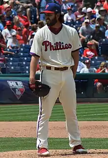 Philadelphia promoted Davis to the major leagues on June 18, 2018.[10] He made his MLB debut on June 20 against the St. Louis Cardinals.[11] He was the first Cal State Bakersfield baseball player to play in Major League Baseball.[12] He finished the season with a 1–2 record with the Phillies, along with a 4.15 ERA and 38 strikeouts over the course of 32 appearances (34+23 innings pitched), averaging 9.9 strikeouts per 9 innings.[13]