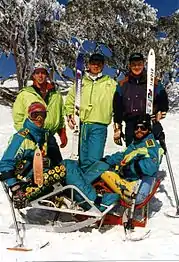 James Paterson was born in Terrigal, New South Wales, and was diagnosed with cerebral palsy.[12] He worked as a marine mechanic for Halvorsen Boats, who supported his overseas preparation in the lead-up to the 1994 Games. Along with competing at the 1994 Winter Paralympics, he also competed at the 1996 IPC Alpine Skiing World Championships, where he won a silver medal and two bronze medals.[13] Two years later, he represented Australia again at the 1998 Winter Paralympics where he was team captain and competed in four events, winning a gold medal in the men's Downhill LW9, and a bronze medal in the men's slalom LW9.[6] He also went on to win a silver medal at the 2000 IPC Alpine Skiing World Championships in the men's giant slalom LW9.[14]