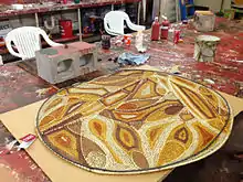 In 1995 a number of women's centres across the Central Desert were set up with the help of Thisbe Purich, who introduced the women there to basket coiling techniques. As the central body of the coil could be made from local grasses, this required little in the way of infrastructure or imported materials.[17] Only the loose binding for the coils, typically coloured wool or raffia, needed to be bought. This technique spread quickly, and by 2001 the first known sculptural works were produced. These were created by the artist Kantjupayi Benson, and included an emu followed by a dog and set of “camp crockery”.[18] In 2005, the large scale work Tjanpi Grass Toyota won the 22nd National Aboriginal & Torres Strait Islander Art Award. Tjanpi Desert Weavers is the best known art centre working in this tradition.