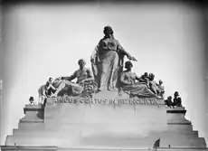 When the Australian Mutual Provident Society commenced business in Sydney in the Colony of New South Wales in 1849, its first premises were located at 314 George Street. However, the growing business of the society meant that it changed premises multiple times in its early years.[1] In 1864, the AMP Society commissioned a new principal office on the eastern side of Pitt Street (No. 98), on a site that now contains Wales House, which was designed by Melbourne architects Reed and Barnes (supervised by Edmund Blacket).[2] The AMP 'Amicus' group that depicts "Australia receiving the Gifts of Peace and Plenty" atop this new building was sculpted in sandstone by Charles Summers.[3]