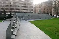 The memorial comprises a semicircular curved wall of grey-green granite slabs from Western Australia (Verde Laguna granite from Jerramungup), cut in Australia before being shipped to London. The granite stones are inscribed with the names of 23,844 towns in which the Australian soldiers were born, in Australia, the UK and elsewhere. Parts of some town names are picked out in bolder type, creating the names of 47 battles in which Australia was involved in a larger font. In summer months, water runs down over the names, intended to evoke "memories of service, suffering and sacrifice".[1] The curved wall is set facing a downwards slope of grass, forming an amphitheatre.