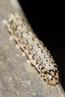 The full-grown larva is about 1+14 inches long, moderately stout and of uniform thickness. The head is ochreous, with a black stripe on each side; the back of the larva is greyish-green, and the under surface pale greenish-ochreous;, there is a rather large, shining black mark above each spiracle; the dorsal, sub-dorsal and lateral lines are orange-yellow and very conspicuous, the two upper lines being very much broken; there are several minute black warts below the spiracles, and a series of very small black marks on the orange dorsal line.[9]