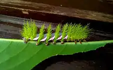 The larvae feed on Morus alba, Morus nigra and Fraxinus americana.
