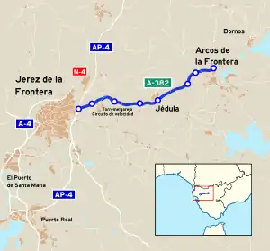 The Autovía A-382 is a local autovía in Andalusia, Spain. It is 27 km (16.8 miles) long and runs from the Autopista AP-4 at Jerez de la Frontera to Arcos de la Frontera. It was originally part of the N-342 road.