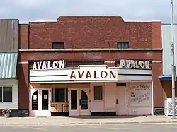 The Avalon Theater is a Historic Art Deco style Movie theater located in the commercial district of Larimore, North Dakota, United States. Built in 1938 as a 350-seat theater, the Avalon's most significant feature is its Art Deco detailing, especially the marquee, box office, and entry doors and continuing with simple Art Deco geometry motifs in the interior, all of which has survived. The building is constructed of brick with a parabolic poured concrete floor in the seating area to ensure a good view for all. The building still functions as a movie theater, with its original projectors, and also is home to local live theater groups.