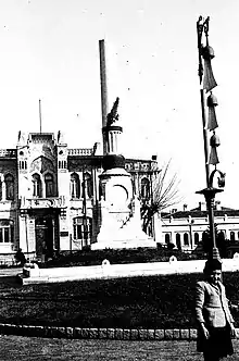 The memorial's foundation stone was laid on April 2, 1914, by Minister of War Enver Pasha.[2] Its construction lasted two years and it was inaugurated in 1916.[1] Designed by the renowned Turkish architect Vedat Tek, the conical columnar monument features a broken top made of white marble. The broken top symbolizes the flight mission's incomplete status. A branch of laurel made of bronze is fixed on the lower half of the column. The monument is about 7.50 m (24.6 ft) high.[1] A large bronze medallion is attached on each of the two opposite sides of the marble base on which the column stands. On one medallion are inscribed the names and the officer ranks of the victims. On the other are depicted a monoplane, the Beyazıt Tower and the landscape of Istanbul is the form of a relief.[3]