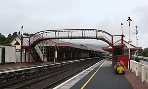 The station has a passing loop 40 chains (800 m) long, flanked by two platforms. Platform 1 on the down (northbound) line can accommodate trains having fourteen coaches, whereas platform 2 on the up (southbound) line can hold fifteen.[11] The junction between the Strathspey Railway and Network Rail lies to the south of the station and was controlled from the station signal box, which also controlled a large portion of the main line either side of here (from Kingussie all the way to Culloden Moor since 1979) as well as the immediate station area.[12] The station was resignalled and the loop extended in 2019, which also saw the signal box closed with control transferring to Inverness.[13]