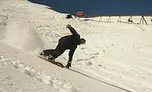 A snowboarder freeriding in deep snow. In the background, the Olympiabahn funicular built for the 1976 Olympics can be seen.