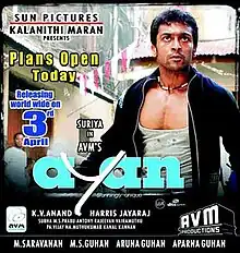 The film was launched in Chennai, while filming also took place in various locations out of India, including Namibia, Malaysia, Zanzibar and South Africa. It released on 3 April 2009 worldwide to positive reviews.[5][6] Ayan was declared as the solo blockbuster of 2009 in Tamil cinema,[7] collecting about 80 crore (US$10 million) worldwide.[3][8][9][10] The film was also successful in Kerala.[2]