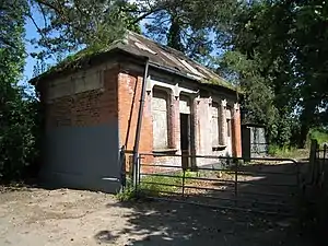![]() Street-level building of the former station in May 2009, seen from the B4031 road. The path on the right leads up to the site of the former up platform. | |