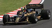 De Angelis was replaced at Lotus by Scotland's Johnny Dumfries after Senna vetoed Derek Warwick from joining the team, saying that Lotus could not run competitive cars for two top drivers at the same time. Senna allegedly pushed for his former flatmate and fellow Brazilian Maurício Gugelmin to join the team as a pure number two driver, but the team's major sponsor John Player & Sons (JPS) insisted on a British driver, which led to the signing of Dumfries. Senna later admitted "It was bad, bad. Until then I had a good relationship with Derek."[42] Senna started the season well, coming second in Brazil behind the Williams-Honda of fellow countryman Nelson Piquet, and winning the Spanish Grand Prix by just 0.014s from Piquet's teammate Nigel Mansell in one of the closest finishes in Formula One history to find himself leading the World Championship after two races.[43] Although the 98T was like the 97T which came before it, a quick car with superiority on tight, bumpy circuits but plagued with poor reliability, particularly in the second half of the season it saw him drift behind the Williams pairing of Mansell and Piquet as well as defending and eventual champion, Alain Prost. Nonetheless, Senna was once more the top qualifier with eight poles, with a further six podium finishes included another win at the Detroit Grand Prix, thus finishing the season fourth in the driver's standings again, with a total of 55 points. The 1986 F1 cars were the most powerful cars in history, with Senna's 98T producing over 1,300 bhp (969 kW; 1,318 PS) in qualifying and 850 bhp (634 kW; 862 PS) in the race.[44]