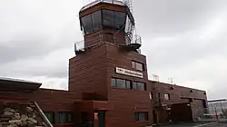 The terminal consists of a single building, with an integrated control tower, capable of handling 120 passengers per hour.[16] The facade is covered in Russian larch;[17] the focus on wood as a dominant material was common for Norwegian architecture the 1990s, and is also seen at Oslo Airport, Gardermoen (opened in 1998) and for the venues of the 1994 Winter Olympics.[6] The terminal was designed by Alta-based architect Solveig Thorsen and is shaped like an aircraft wing, similar to the terminal building at Gardermoen. There is a single gate at the airport, which prior to the installation of security control was 17 steps from the entrance.[17]