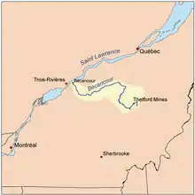 The Bécancour takes its source from the lake of the same name in the town of Thetford Mines, in the Chaudière-Appalaches region. It flows west into William Lake at Saint-Ferdinand, changes course northwards towards Inverness, turning westward there and continuing to flow west across the Centre-du-Québec region for most of its length. The river takes a turn northwestward at Saint-Wenceslas, finally emptying into the Saint Lawrence River near the heart of the city of Bécancour.[1]