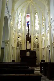 Based on neo-gothic design, Béthanie is a stylish composition of symmetrical cylinders. Apart from that, ogive, tracery, stained glass as well as Gothic arched windows can be found in the building. With a high ceiling and pitched roof, the George C. Tso Memorial Chapel is a typical illustration of neo-gothic architectures in Béthanie, though in a much simpler style and smaller scale. Among its nineteen stained glass windows, nine were originals. The remaining ones, either in disrepair or missing, were reproduced hand-made in the Philippines. Also, only four out of the twelve statues of the apostles, originally standing on corbels above the altar, have been found. Although the genuine ones were unavailable for exhibition, the Academy has replicated the statues with a silicone molding technique. Moreover, many neo-gothic structures within the perimeter have been conserved. One of these examples are the flying buttresses that were used to support the exteriors of buildings in the past. Although no longer functional, they have been restored to maintain authenticity. The Rib vaults, built in to support the ceiling and roof have also been retained in the chapel for decorative purposes.