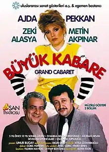 Büyük Kabare was co-produced by International Art Shows Inc. and Devekuşu Cabaret Theatre. The show started at the Open-Air Theatre in Istanbul on 6 August 1982, and continued for more than a year and toured several cities, including Ankara and İzmir.[1] The tickets for the musical were sold out immediately in many cities, including the İzmir Fair where it sold 35,000 tickets over the course of a few days.[2] O dönem birçok çeşitli müzikal ve tiyatro gösterileriyle Türkiye'de şöhretlerini artıran Devekuşu Cabaret, which had improved its reputation with various musical and theatrical performances in Turkey, was led by Metin Akpınar and Zeki Alasya. The cabaret started to cooperate with Ajda Pekkan for the musical. Pekkan, who was disappointed due to her poor performance in the Eurovision Song Contest 1980, came to the stage with this show for the first time after a 2.5-year break. Thus, for the first time, she appeared in a musical.[1] Erol Dallı, a columnist who evaluated the musical in the Milliyet newspaper, said: "In this hasty cabaret, adorning the jokes with little swears and the disconnections between the episodes may not be appreciated by the audience. But still the Great Cabaret will attract a great number of viewers." [3] Some of the songs Fikret Şeneş wrote for Ajda Pekkan for this musical were included in Pekkan's Süperstar '83 (1983) album.[4][5]