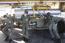 B28FI being unloaded from a Boeing B-52H in 1984. The 3 ground crew show the size of this weapon