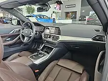 Most of the interior is carried over from the G20 3 Series upholstered in SensaTec faux leather with front sports seat being standard. The interior is offered in five colours with full leather upholstery being optional. The rear seats fold down to provide a total boot capacity of 440 L (15.5 cu ft). The iDrive 7.0 system is standard and features an 8.8-inch screen on the centre console along with a 5.1-inch screen in the instrument cluster. A 10.3 inch screen for the infotainment system along with a 12.3 inch screen for the instrument cluster are optional. The iDrive 7.0 has over-the-air updates for the navigational maps and operating system, and features a voice-controlled digital assistant. The 4 Series comes standard with the BMW navigation, the next-generation BMW head-up display, which has a 70 percent larger projection surface, and 3D environment visualization within the digital instrument cluster. Apple Car Play and Android Auto are also standard interior amenities. A Driving Assistance Professional package is optional, which adds adaptive cruise control with stop and go, lane-keep assist with side collision avoidance, and rear automatic emergency braking.[11][12]