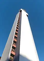 Construction of the BT Tower commenced in July 1963 and was completed in September 1965. The tower became operational in December 1966 and was officially opened by the Lord Mayor of Birmingham, Alderman James S. Meadows, on 5 October 1967.[3] It was designed by the Ministry of Public Building and Works and M.H. Bristow was the senior architect.[4] It has 26 storeys, housing technical areas and offices, and five levels of circular aerial galleries at the top.[5] There is a roof-mounted crane.[6]