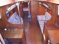 The interior of the Baba contains a lot of custom teak work. Some versions of the boat have the entire interior staved with teak. The cabin sole is made from teak planking separated with holly strips. It has a very spacious-feeling 6'4" of headroom. Sleeping berths consist of a spacious V berth with good storage below and access to the chain locker via louvred doors, a full length berth in the main cabin on either side of the boat and on many models, a quarter berth on the aft starboard quarter, however in some models this was replaced by extra stowage. A small galley is built on the port aft side and opposite is a spacious chart table. Forward on the starboard side are the heads. The engine is mounted below the cabin companionway and is boxed in with a substantial teak housing. There are lockers and stowage areas all over the boat. The Baba 30 typically came with two separate water tanks which reside under the port and starboard berths, each holding about 100 L (25 US gal). However many variants of this tankage have been discovered on different Babas.