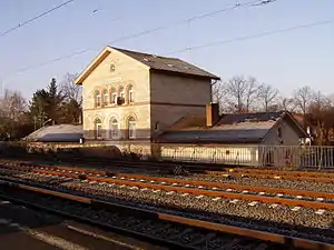 The station was built for the Rhine-Main Railway and put into operation on 25 December 1858. In 1868, the first section of the Odenwald Railway was opened to Groß-Umstadt. In 1876, the three-storey station building was erected, which still stands today. It was built in light-coloured sandstone. In 1904, a small restaurant was opened. The station building is listed as a monument under the Hessian Heritage Act.[4]