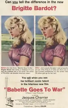 Babette Goes to War (French: Babette s'en va-t-en guerre) is a 1959 French CinemaScope film starring Brigitte Bardot. It was Bardot's first movie since becoming a star where she did not take off her clothes.[2]