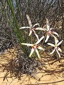 Babiana brachystachys is a species of geophyte of 20–30 cm (7.9–11.8 in) high that is assigned to the family Iridaceae. It has cream or pale pink, only slightly mirror-symmetrical flowers that are pink on the reverse with a long narrow tube that splits into six tepal lobes, three stamens, a style that divides in three branches opposite the tip of the anthers and line-shaped leaves that are circular in cross section.[1] It is an endemic species of South Africa that can be found on sandy hills and inland dunes in the Northern Cape province. It flowers in September and October.[2]