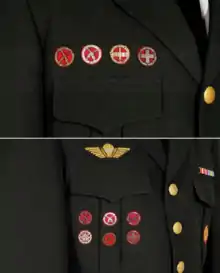 Badges of the Danish Military are military decorations issued to soldiers who achieve a variety of qualifications and accomplishments while serving active or reserve duty in the Danish military. They are worn, on the service dress or barracks dress, either right above or on the breast pocket, depending on whether there are Danish Parachutist Brevets.[1] There is no limit to the number worn and there is no designated order for the badges.[2]