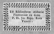 The attached Chiostro degli Aranci (Cloister of the Oranges) contains a fresco cycle (c. 14351439) on the life of St Benedict, rooted in the context of the Badia's revitalizing by a prominent monastic reformer of Portuguese origin, Abbot Dom Gomes Eanes (OSB) ("Beato Gomezio" in the contemporary Italian sources) (c. 13831459).[3] Many attribute the frescos to the Portuguese painter Giovanni di Consalvo, a generally unknown follower of Fra Angelico. They are more likely the work of Zanobi di Benedetto Strozzi (1412–68) under the guidance of Angelico himself.[4][5] The fourth scene in the cycle was repainted c. 1526-1528 (St. Benedict chastising himself) by the young Bronzino. The cloister itself was built under the direction of Antonio di Domenico della Parte and Giovanni d'Antonio da Maiano,[6] with some assistance by Bernardo Rossellino.[7][8]