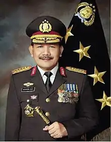 Police-General Badrodin Haiti was the Chief of the Indonesian National Police from 16 January 2015 until 13 July 2016, succeeding, Police-General Sutarman. On 16 January 2015 Badrodin was appointed by Indonesian President Joko Widodo to be the Acting Chief of Indonesian National Police replacing Sutarman, who officially retired from the service and awaiting for elected Police Chief Police-Commissioner General Budi Gunawan who was a suspect on a corruption case.[1][2] On 16 April 2015, he was confirmed unanimously by Indonesian House of Representatives and sworn in by President Joko Widodo on 17 April 2015. He was replaced by Police-General Tito Karnavian.[3]