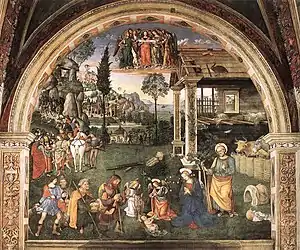 The central wall features the Adoration of the Shepherds, depicting the arrival of the Magi procession in the background. The scene is set on a lawn before the stable, portrayed with sotto in su perspective. A landscape can be seen behind a window in the stable.