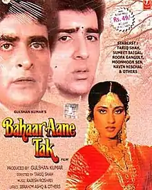 Bahaar Aane Tak is a 1990 Bollywood family drama movie directed by Tariq Shah and produced by Gulshan Kumar. The cinematographer of this film is Ajay Prabhakar. The film revolves around a man who coincidentally marries a woman who was once raped by his close friend. It stars Roopa Ganguly, Moon Moon Sen, Sumeet Saigal, Tariq Shah, Shammi, Ram Mohan and Navin Nischol. The music of the film was composed by Rajesh Roshan.[1][2][3][4]
