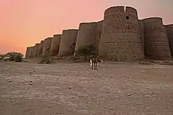 East of Bahawalpur is the Cholistan Desert which covers about an area of 20,000 km 2 of Bahawalpur and 1000 km2 of Rahim Yar Khan and extends into the Thar Desert of India. The region was once watered by the Hakra River. At one time there were 400 forts in the area and archaeological finds around the Derawar Fort, the only place with a perennial waterhole, indicate that it was contemporaneous with the Indus Valley Civilisation. The average annual rainfall is only 12 cm, and the little cultivation that exists is made possible by underground wells, drawn up by the camels. The water is stored in troughs, built by the tribes, between sandhills and din waterholes called tobas. The forts here were built at 29 km intervals, which probably served as guard posts for the camel caravan routes. There were three rows of these forts. The first line of forts began from Phulra and went to Lera, the second from Rukhanpur to Islamgarh, and the third from Bilcaner to Kapoo. They are all in ruins now, and you can see that they were built with double walls of gypsum blocks and mud. Some of them date back to 1000 BCE, and were destroyed and rebuilt many times.