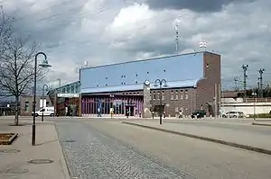 View of the station complex to the southeast. A Karlsruhe Stadtbahn S5 train is on its way to Mühlacker.