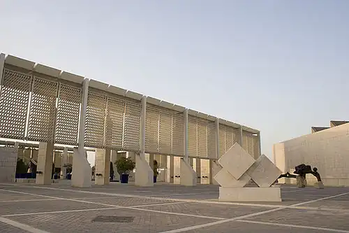 The modern museum was designed by Danish architects Krohn & Hartvig Rasmussen and officially opened in December 1988. It was constructed on an artificial peninsula overlooking the neighbouring island of Muharraq.[4] The museum is made of two buildings spanning a floor space of 20,000 square meters.[4] The complex contains six permanent exhibitions, an educational hall, a gift shop and a cafeteria, in addition to administrative offices, laboratories and warehouses for the Conservation of holdings and parking.[7] The museum celebrated its 25th anniversary in 2013 by renovating the Hall of Dilmun Graves, and hosting an international conference on museum development.[8]