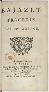 Bajazet (French: [baʒazɛ]) is a five-act tragedy by Jean Racine written in alexandrine verse and first performed at the Hôtel de Bourgogne theatre in January 1672, after Berenice, and before Mithridate. Like Aeschylus in The Persians, Racine took his subject from contemporary history, taking care to choose a far off location, the Ottoman Empire. In 1635, the sultan Murad IV (Amurat, in the work of Racine) had his brothers and potential rivals Bajazet (Bayezid) and Orcan (Orhan) executed. Racine was inspired by this deed, and centered his play on Bajazet. Racine also develops several romantic subplots in the seraglio. The action is particularly complex, and can only be resolved by a series of deaths and suicides.