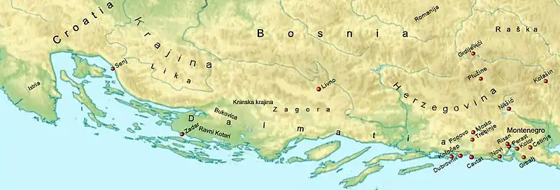 Between January and the end of April 1684, the Republic of Venice accepted 4,200 families as settlers on the Venetian–Ottoman frontier, including 20,000 warriors. The Venetians provided them with food and 1,800 rifles, and their leaders were given monthly pay. The families were settled in the territory of Zadar and Šibenik, and around Klis.[46] Pivljanin and his brother Dimitrije served in the cavalry bands in Zadar until Antonio Zeno, the extraordinary provveditore of Kotor, requested that they be sent for service in the Bay of Kotor. This was approved by Lorenzo Donà, the provveditore of Dalmatia, on 12 April 1684.[47] In September 1684 Pivljanin was documented as having been with his band in Herceg Novi, and in October in the area of Livno.[48] The Venetian Senate thanked Pivljanin and Jovan Sikimić for their victory at Jezero, and approved Zeno's decision to reward them medals and sequins, on 12 October 1684.[49] Marino Mikiel, a Venetian commissary, writing of the state of the Venetian cavalry in Dalmatia on 26 January 1685, highlighted that Stojan Janković and Pivljanin received the wages of cavalry soldiers due to their merit and by grace of the state, without having to effectively serve as soldiers.[49] In March 1685 Pivljanin informed the Venetian extraordinary provveditore about his band's operations in the territory of the Republic of Ragusa; his band numbered 130 fighters and had three harambašas: Miho Kolumbara; Miloš Lepirić; and Božo Lučić.[50] In February, they had captured a caravan with wheat in Zupci, stolen some cattle and burnt down the village of Glavska, attacked Cavtat and returned to Trebinje.[51]