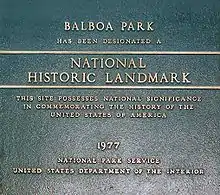 Balboa Park hosted the 1915–16 Panama–California Exposition and 1935–36 California Pacific International Exposition, both of which left architectural landmarks. The park and its historic Exposition buildings were declared a National Historic Landmark and National Historic Landmark District in 1977, and placed on the National Register of Historic Places.[1][5]