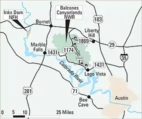 Balcones Canyonlands is a national wildlife refuge located in the Texas Hill Country to the northwest of Lago Vista, Texas.[1] The refuge was formed in 1992 to conserve habitat for two endangered songbirds, the golden-cheeked warbler (Setophaga chrysoparia) and the black-capped vireo (Vireo atricapilla), and to preserve Texas Hill Country habitat for numerous other wildlife species.[2] The refuge augments a similarly named preserve in Austin called the Balcones Canyonlands Preserve.