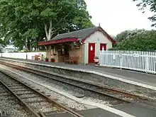 The original building was demolished in 1985 and replaced by a brick building housing a small ticket office and waiting area, which was built in 1985 and was opened in 1986 by Jack Nivison, the former President of the Legislative Council of the Isle of Man and MHK for Middle. Before this, the railway station, like several intermediate stopping places on the line, did not provide passenger platforms. The new building, however, was built at platform height, and the platform was long enough for a five-coach train, later increased to seven. The railway station also has a stone-built water tower and crossing-keeper's hut; the latter was extensively modified to house the now-defunct mechanical railway station gates. A crossing-keeper's house on the other side of the road is now a private dwelling. In 2002 the opposite side of the line also received a full-length platform, which also serves the goods siding, and a modern bus shelter was also installed; the platform edging used had previously been employed for the former South Line departure roads at Douglas railway station and was retained for future use when lifted in 1979. There was also a goods shed on the site — a reused wooden building originally from the prisoner of war camp at Knockaloe near Peel, which was also served by the railway during the First World War. Although now extensively modernised and not really recognisable as the railway station that existed until 1985, it remains one of the most picturesque settings on the line and was popular with photographers who had the opportunity to take images of two trains at once. From 2001 to 2012 this railway station was the only crossing place in regular use on the line, as after timetable changes in 2001 there were no crossing trains at Castletown railway station. However, with the introduction of a more intensive high season timetable in 2012, with six trains each way instead of the usual four, some trains have once again been crossing at Castletown, and all trains from 2015.