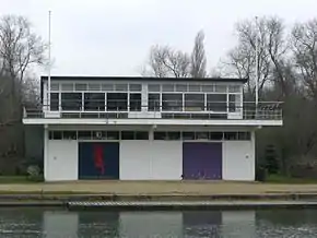The base of the Boat Club for the latter part of the 19th century and much of the 20th century was a grand barge, which was moored on the River Thames at the south side of Christ Church Meadow. The barge was bought from the Skinners' Company in 1859.[5] The present boathouse (semi-detached, with New College occupying the other half) was opened in May 1959. The barge was on view in 1996 at Henley, when it was up for auction.
