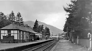 When opened as part of the Callander and Oban Railway on 1 June 1870,[1] Balquhidder station was called Lochearnhead. The station was laid out with two platforms, one on either side of a crossing loop. There were sidings on the east side of the station. The station was renamed as Balquhidder on 1 July 1904.[1] To the north was a goods yard, which opened before the station in 1868 and on the southbound platform was the station building. It also had a signal box, which opened in 1890.