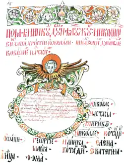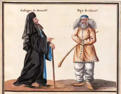 The Habsburgs' effort toward Catholicizing Oltenia mostly concentrated on reforming the Orthodox Church itself—one such measure was to impose Catholic monastic rules on Orthodox monks.[167] By 1726, Steinville's portrait had been added into frescoes of Sfântul Nicolae Church in Băile Olănești (it was covered up after 1739).[168] The issue of Catholic government in an Orthodox land became intertwined with religious disputes in Transylvania, where the Habsburgs had established a Romanian Greek Catholic congregation, part of the Eastern Catholic Churches. It was partly as a result of Gheorghe Cantacuzino's intervention that Ioan Giurgiu Patachi was elected in 1714 as the second Catholic Primate of Bălgrad.[169] Before his death in 1727, Patachi sought to establish an Eastern Catholic bishopric for Habsburg Oltenia, while seeking to "gather under his watch all of Austria's Romanians".[170] This project never took hold. Instead, in January 1728,[171] Râmnic Bishops were given an exclusive privilege in handling Orthodox life in the southernmost pockets of Transylvania, at a time when most other Orthodox Transylvanians were decreed to have been united with Rome. According to scholar Mihai Săsăujan, this state of affairs was preserved into the 1750s.[172] The situation angered the new Catholic converts: Stefan Olshavskyi, the Vicar of Mukachevo, asked that the Ecumenical Patriarchate refrain from consecrating Orthodox priests anywhere in Transylvania.[173]