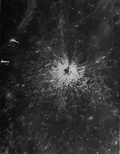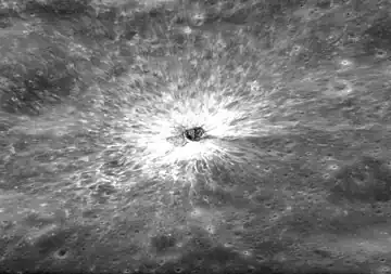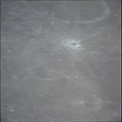 Another fine example of a small crater with extensive bright rays. It presumably was formed by meteoroid impact. Both light and dark rocks are visible in the walls, indicating that more than one layer of rock was penetrated. Rays formed by secondary craters, blocks, and pulverized ejecta extend more than 13 crater diameters beyond the crater proper. The marked irregularity of the pattern southeast of the crater probably was caused by topographic irregularities that deflected the radially outward movement of the ejecta. Arrows indicate smaller bright-rayed craters.[2]