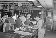 The custom of banging out dates back to at least the 1910s in the British printing industry and is particularly associated with the production of national newspapers in Fleet Street, London. When a worker completed their apprenticeship they would walk through the print room and their colleagues would hit the metal furniture, machinery and racking with hammers and other objects to a slow beat.[1][2] It was also customary for the former apprentice to have a drink with each of his colleagues, which could be many in number.[3] By the 1970s the ceremony included stripping the apprentice and placing him into a truck (a hand pushed cart). The former apprentice would be showered with ink, glue, paper shavings, rubbish and even cat food.[4][3] The truck would then be pushed around the various departments of the printers and even into the street outside, where the apprentice might be tied to a lamp-post or similar.[3][5] The ceremony continues to modern times in some companies, for example in 2012 a Reading print firm dressed an apprentice in women's clothes, covered him in ink and paper and paraded him down the town's High Street.[1]